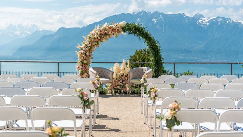 Rendez-vous is set at the Hotel du Léman in Jongny, Switzerland. The ceremony will take place in the garden, with a view on the lake and the mountains.